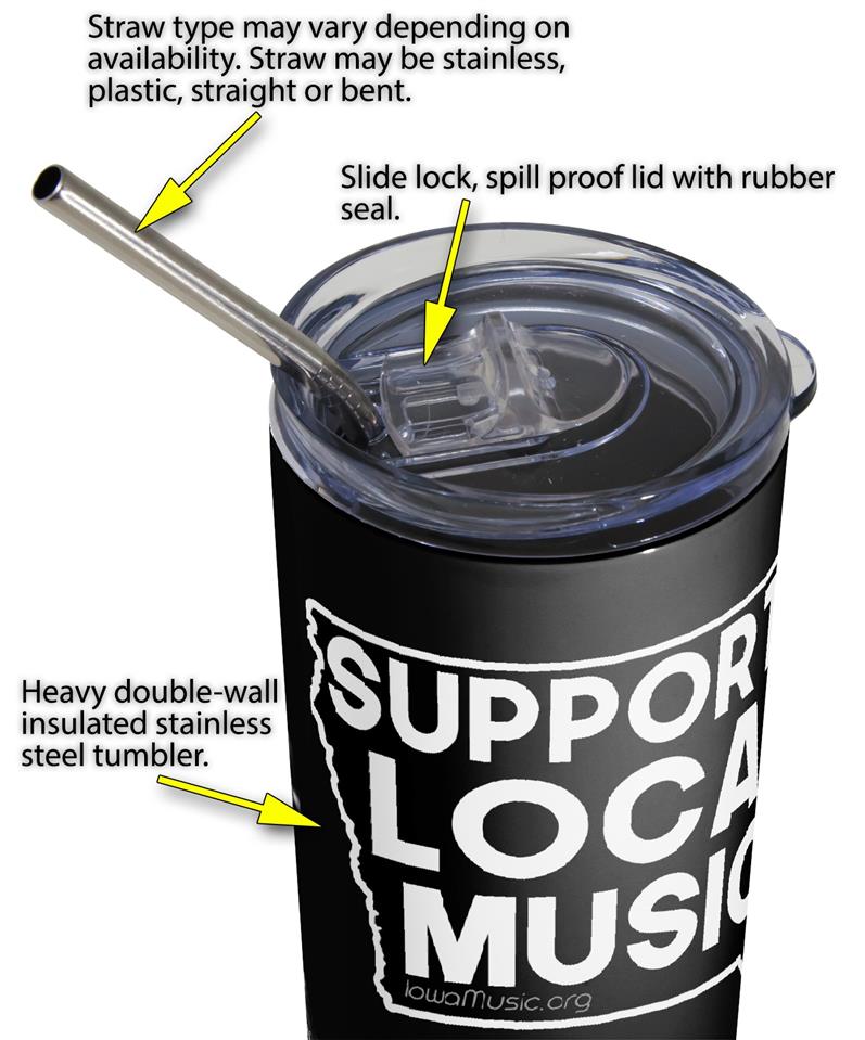 Straw and spill proof locking lid included. Straw type may vary depnding on availablity may be stainless, plastic, straight or bent.